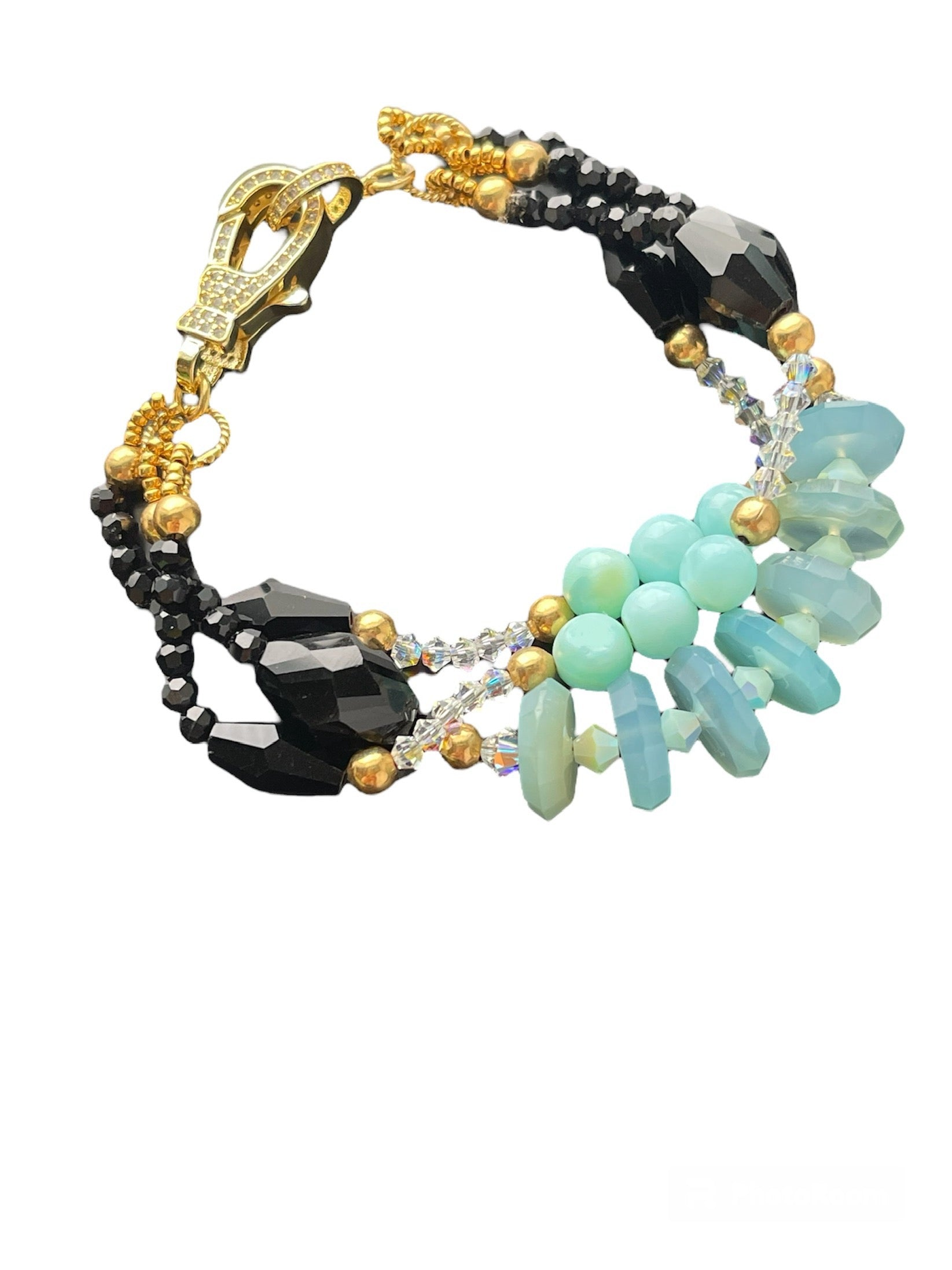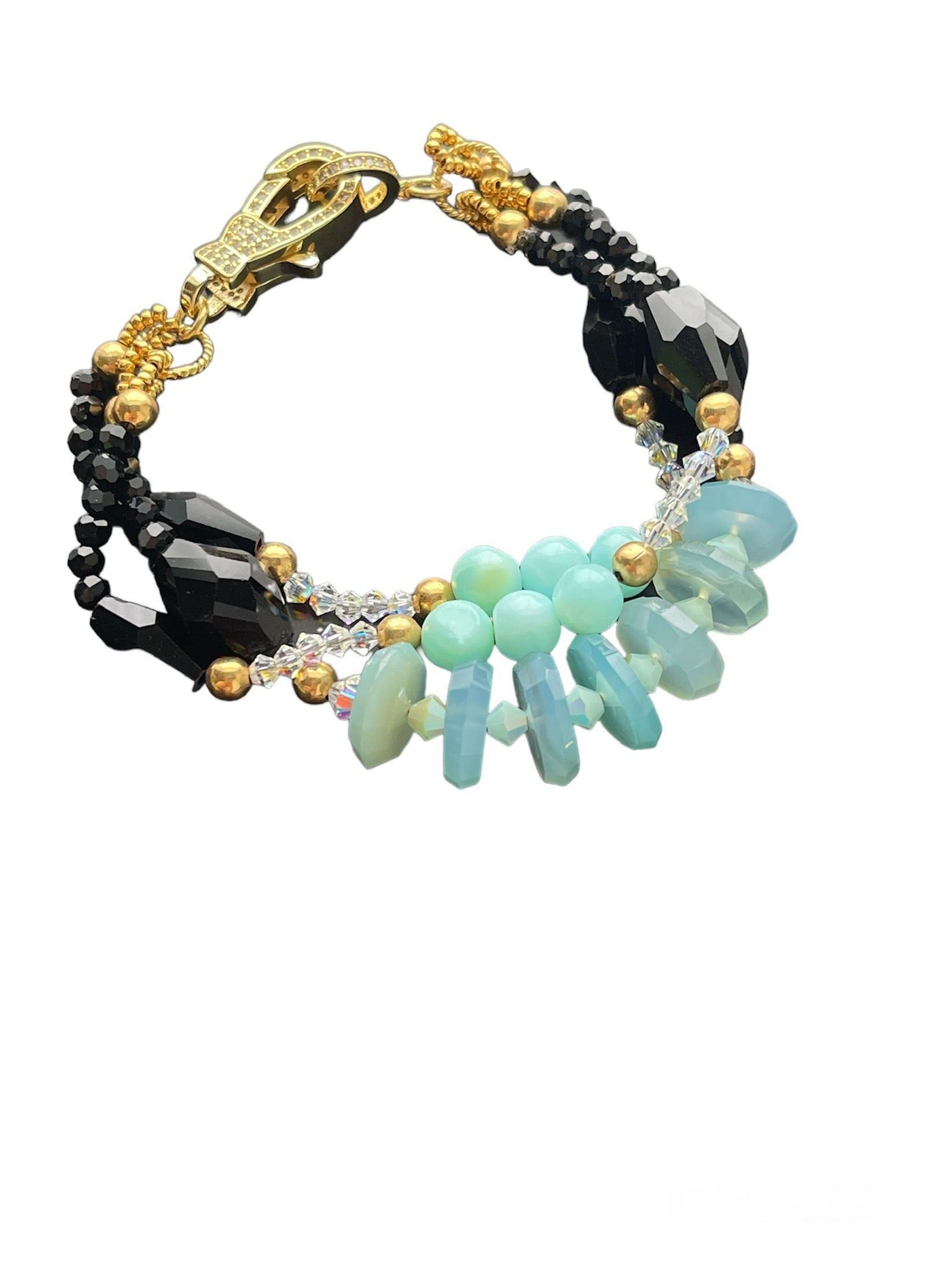 The bracelet that closes with a large, fashionable CZ set lobster claw clasp is made with round and faceted Peruvian opal rondelle beads, Austrian crystals, gold plated and gold filled elements, and jet black glass beads.
