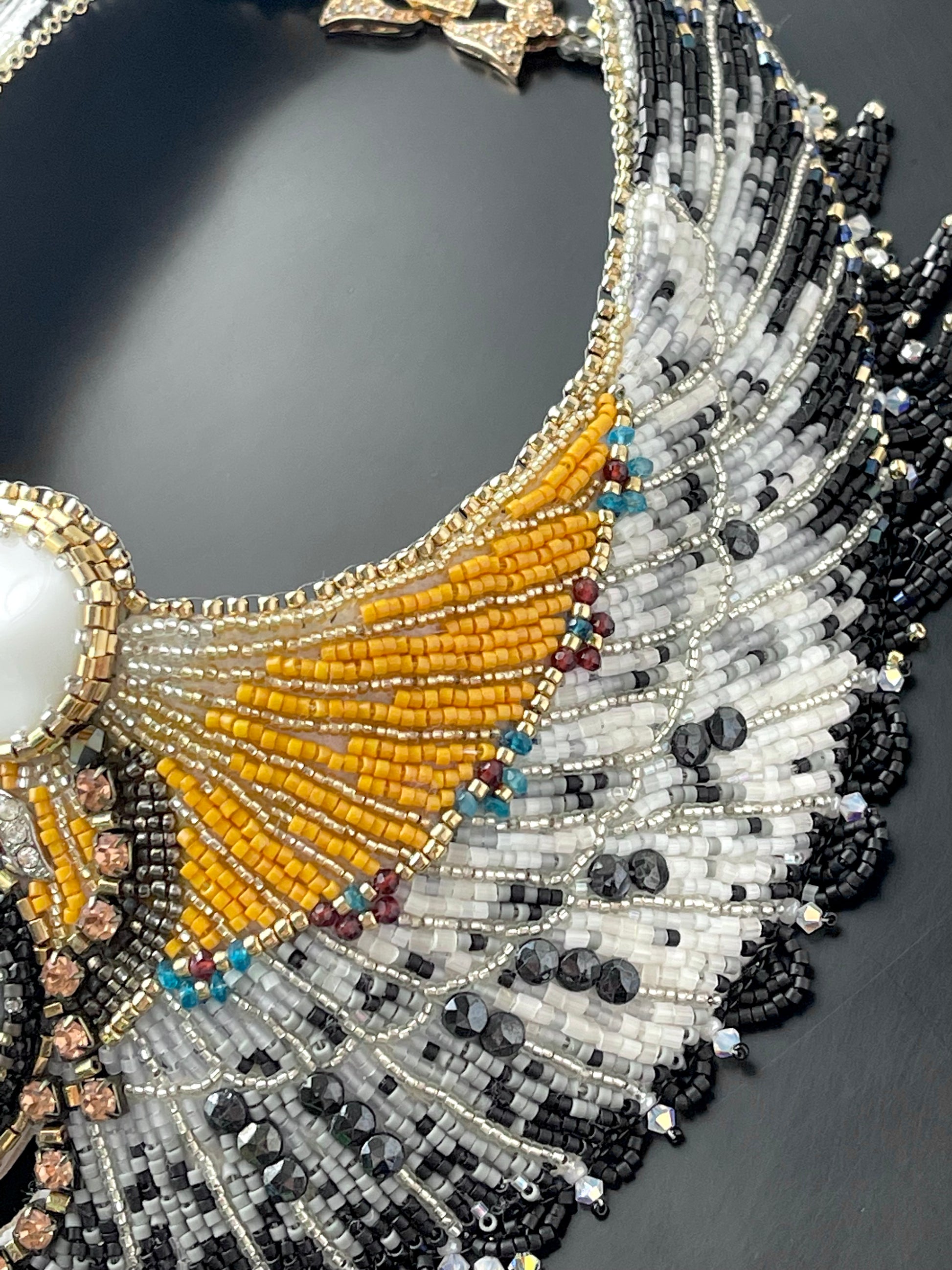 Handcrafted with meticulous attention to detail, this captivating statement piece features a stunning combination of gemstones and glass beads, adorning the beautifully hand-embroidered necklace.