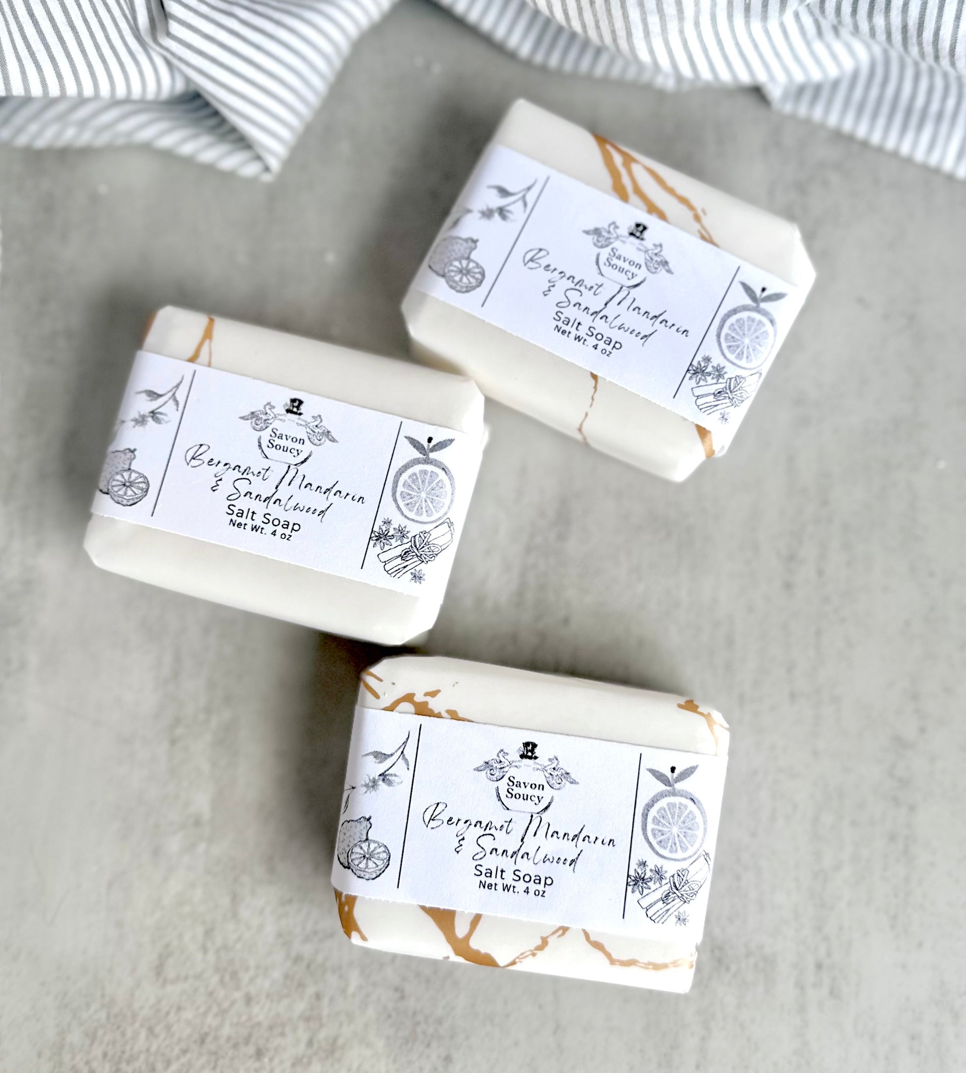 Aromtic bergamot, juicy mandarin and sandalwood, one (1) salt soap bar 4 oz Net Weight.