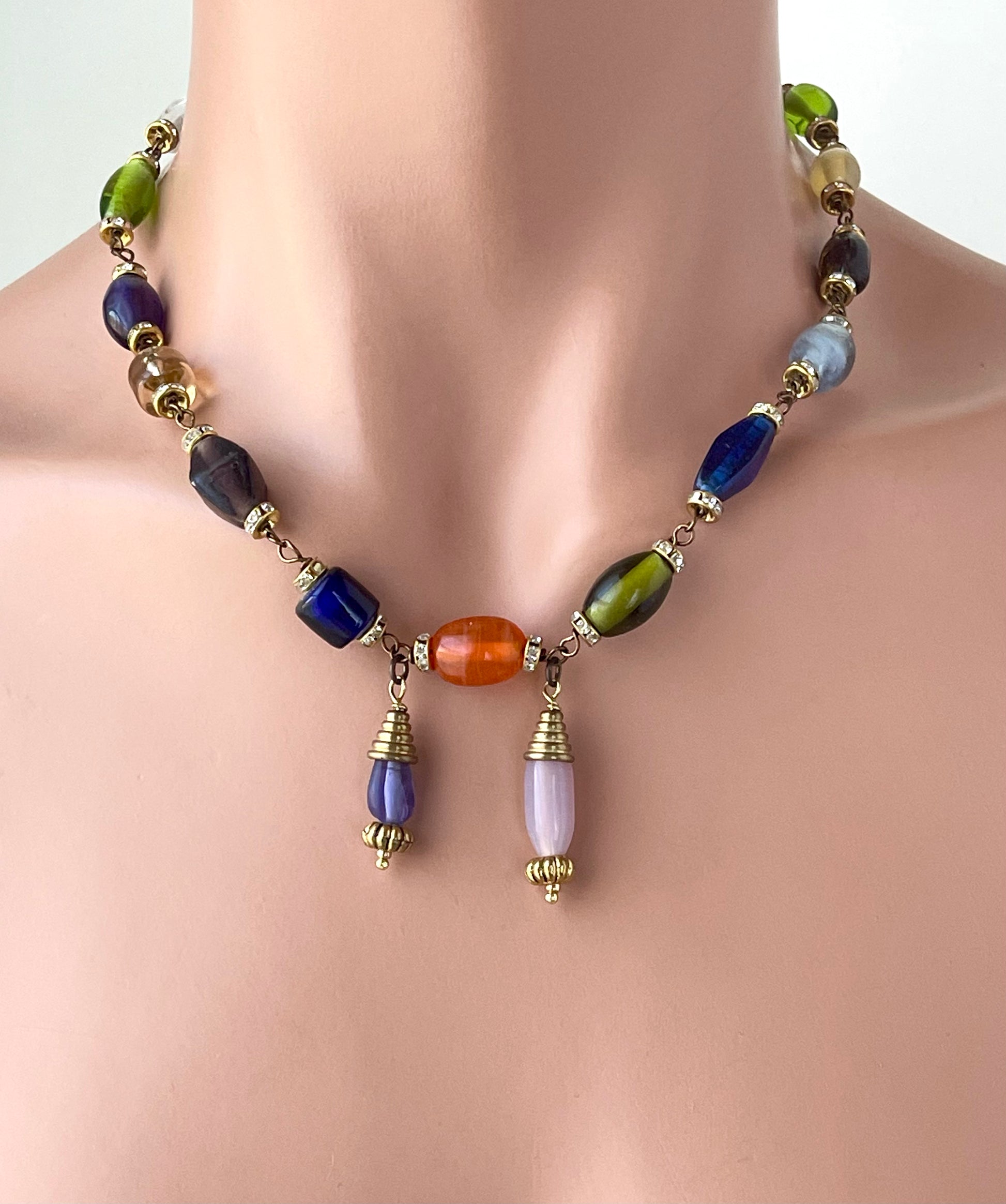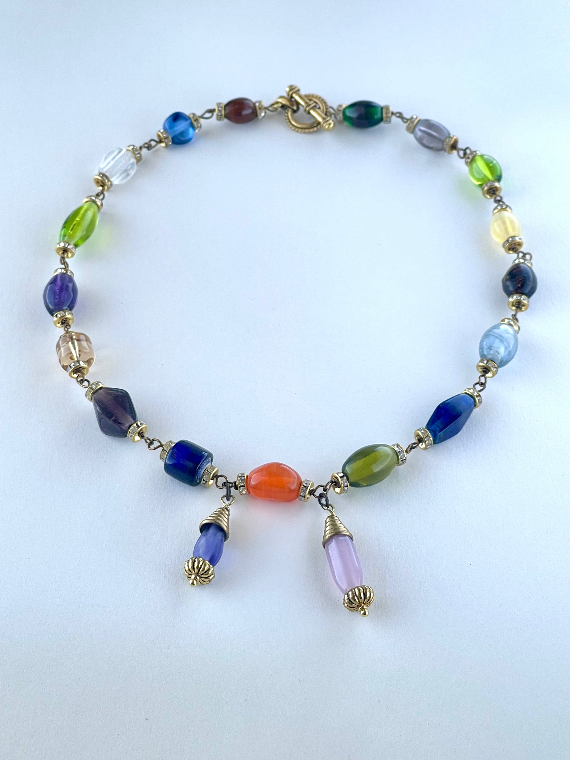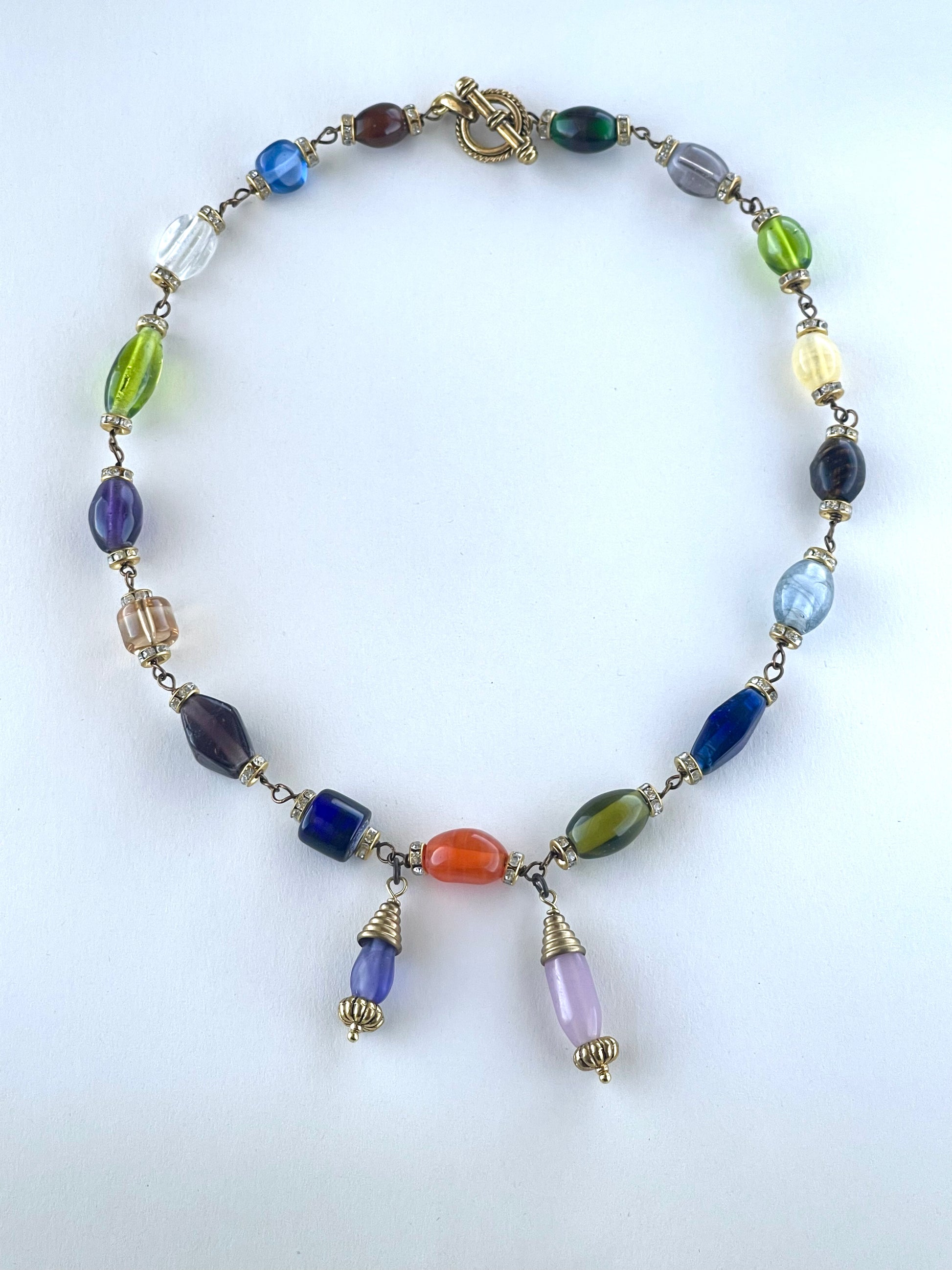 The necklace is made with medium sized raw lampworked glass barrel beads, rhinestone metal spacers, copper wire, brass toggle clasp, and gold plated components.