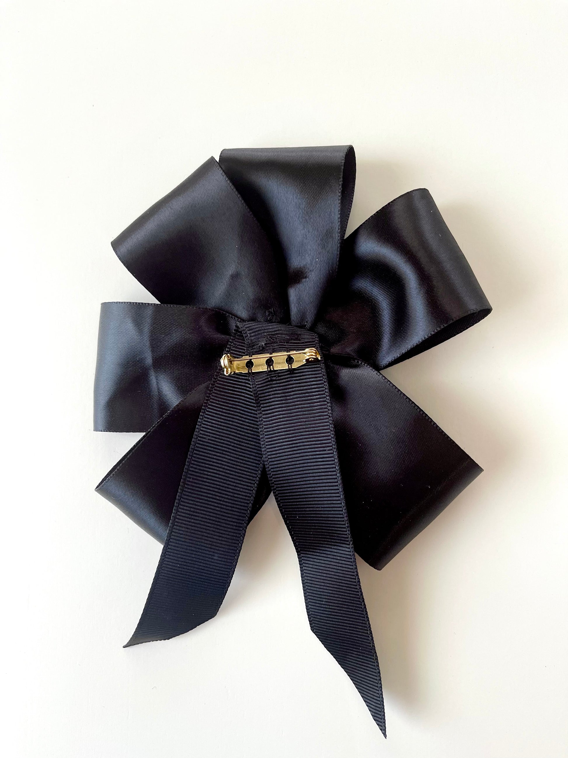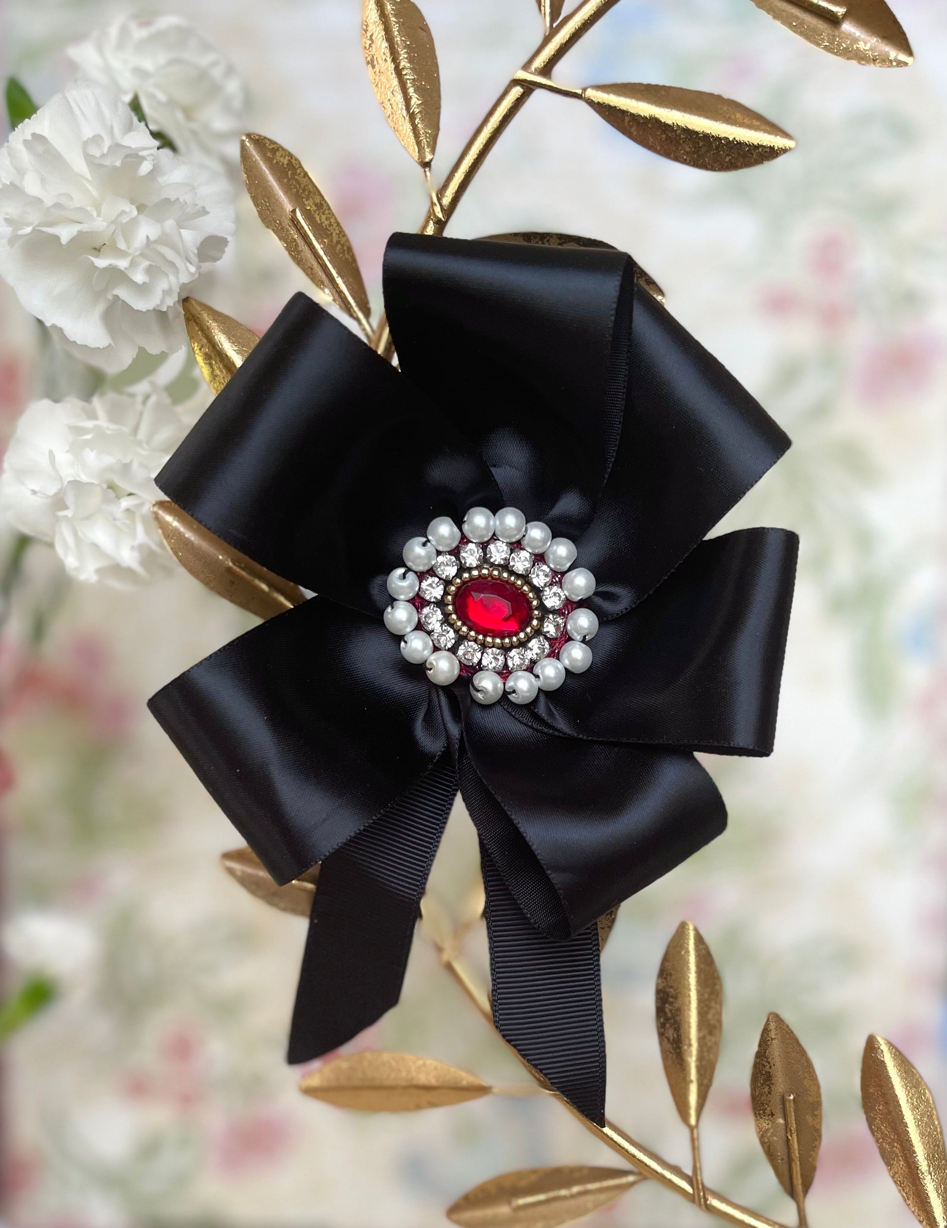 Made with silky black satin ribbon, black ribbed ribbon, white glass pearls, clear rhinestone montees, and vintage pomegranate red crystal cabochon.