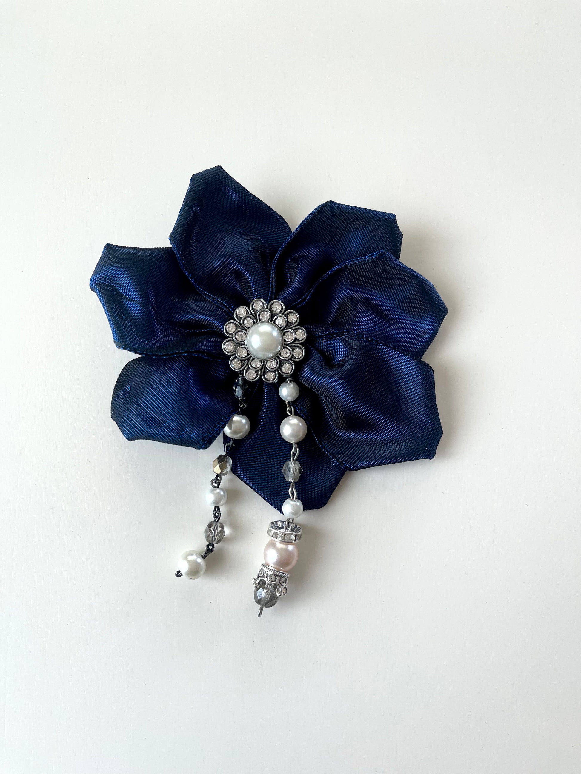 Dark romantic, this floral brooch pin is shaped in the likeness of poinsettia flower. It is made with ribbed satin ribbon, brass button, crystals, and white glass pearls.