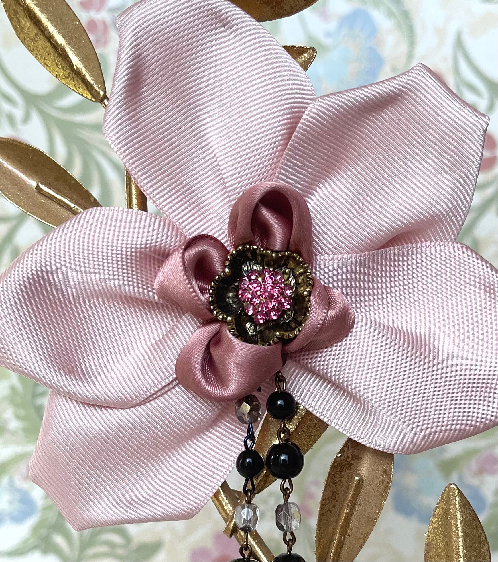 Elegant and chic, this floral brooch pin is shaped in the likeness of orchid flower. It is made with ribbed satin ribbon, vintage brass button, crystals, and black glass pearls.