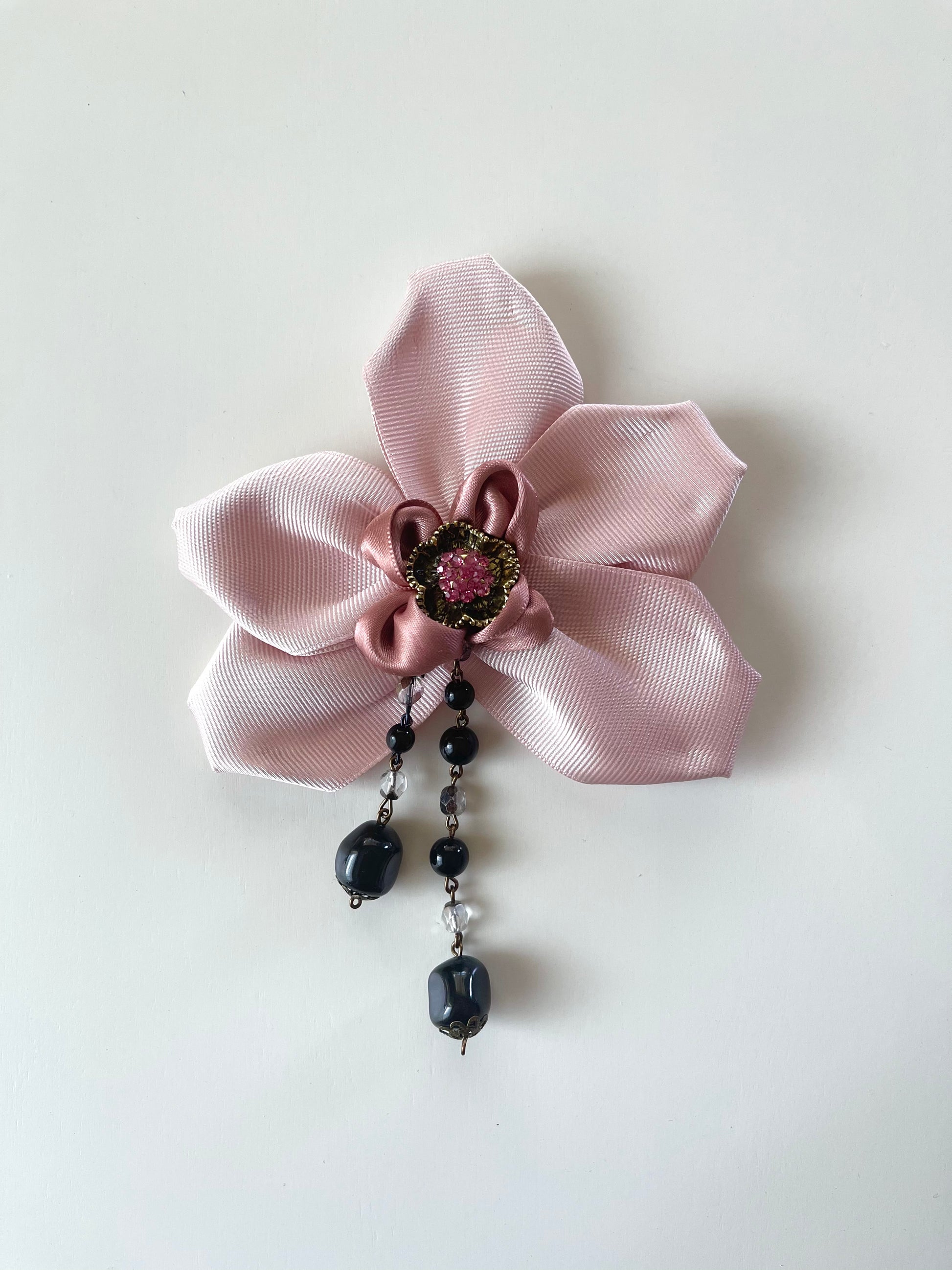 Ribbon Orchid Satin Floral Brooch with Black Pearls
