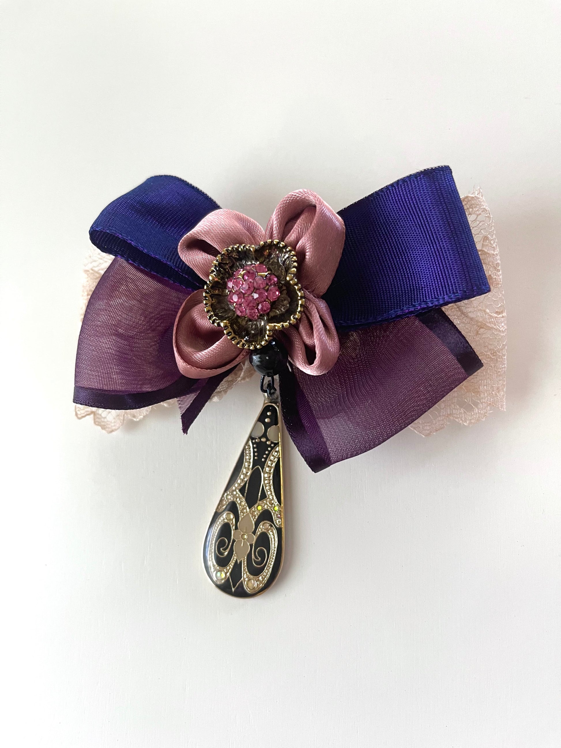 Ribbon Bow Pin with Pink Daisy Center and Lacquer Pendant