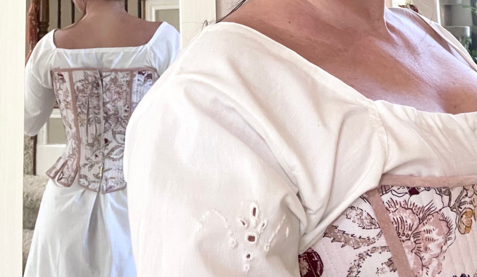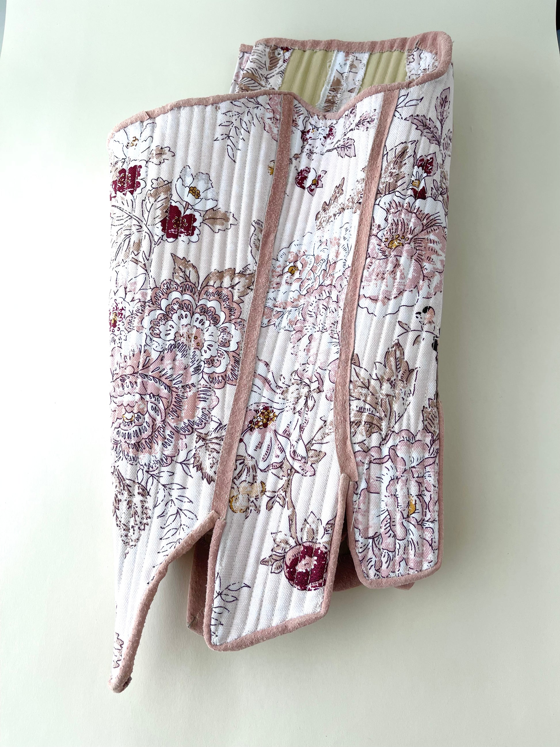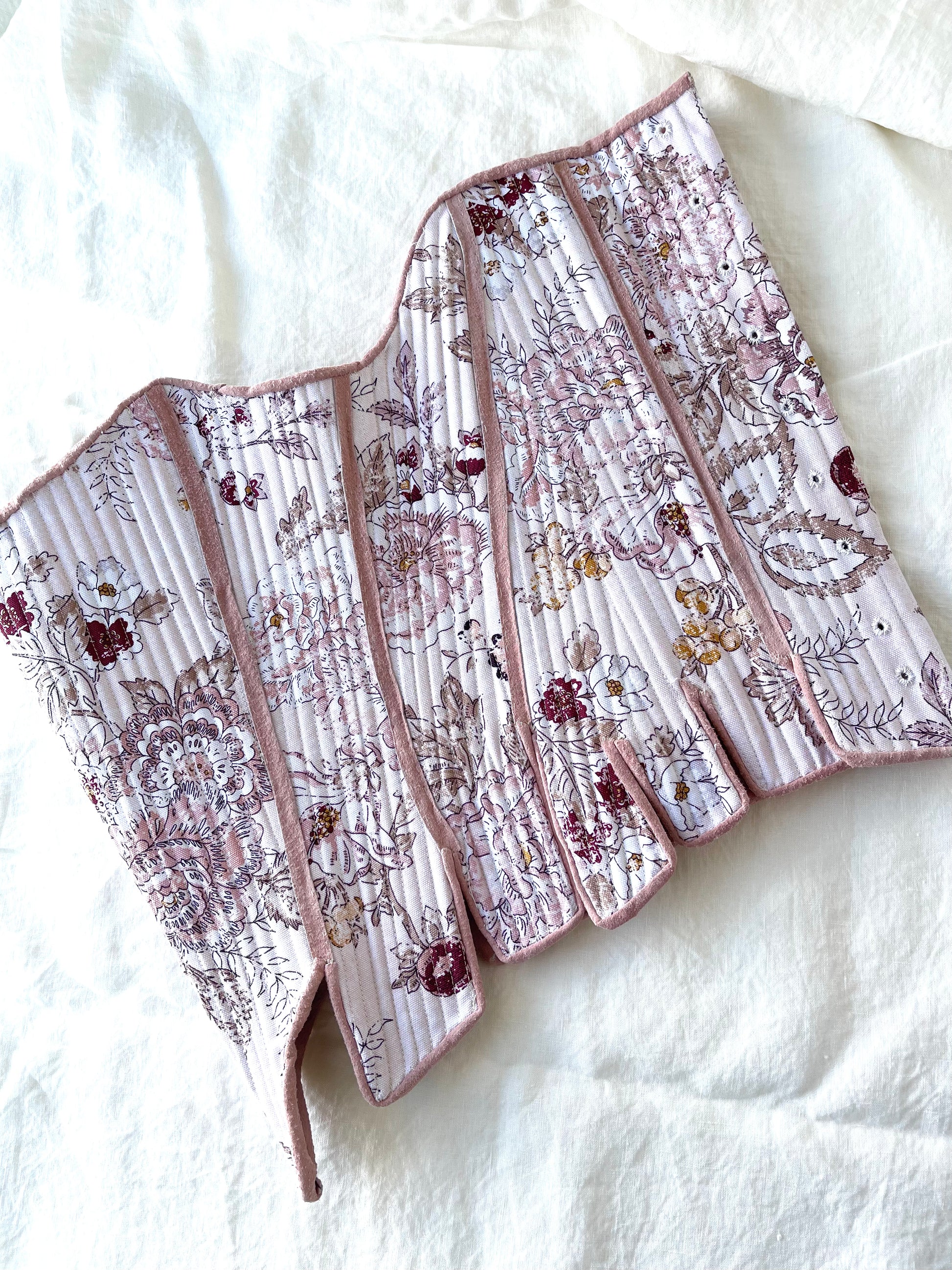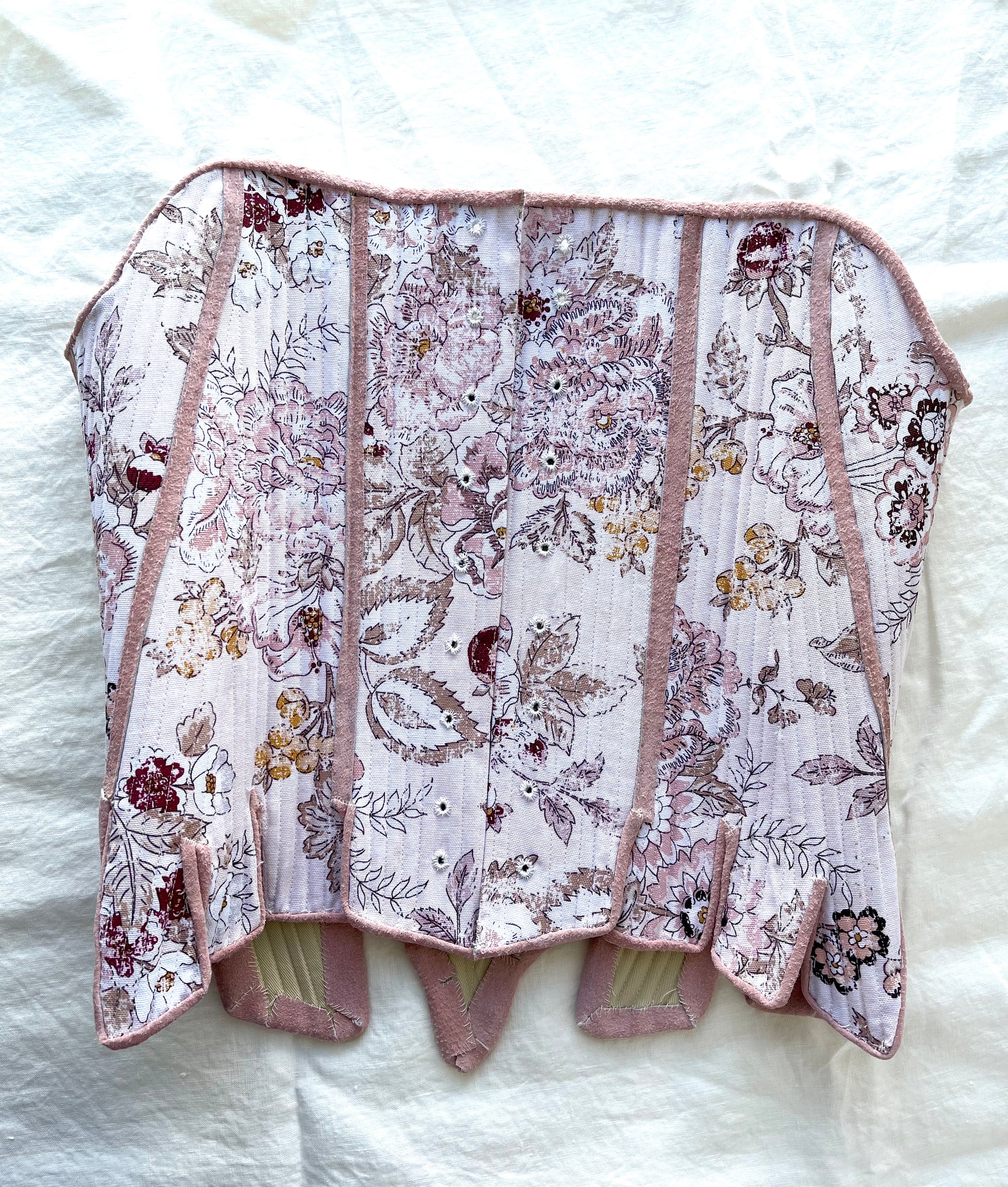 ***This is a custom order for fully boned, 3-layer, romantic floral cotton pair of strapless stays, circa 1750.***