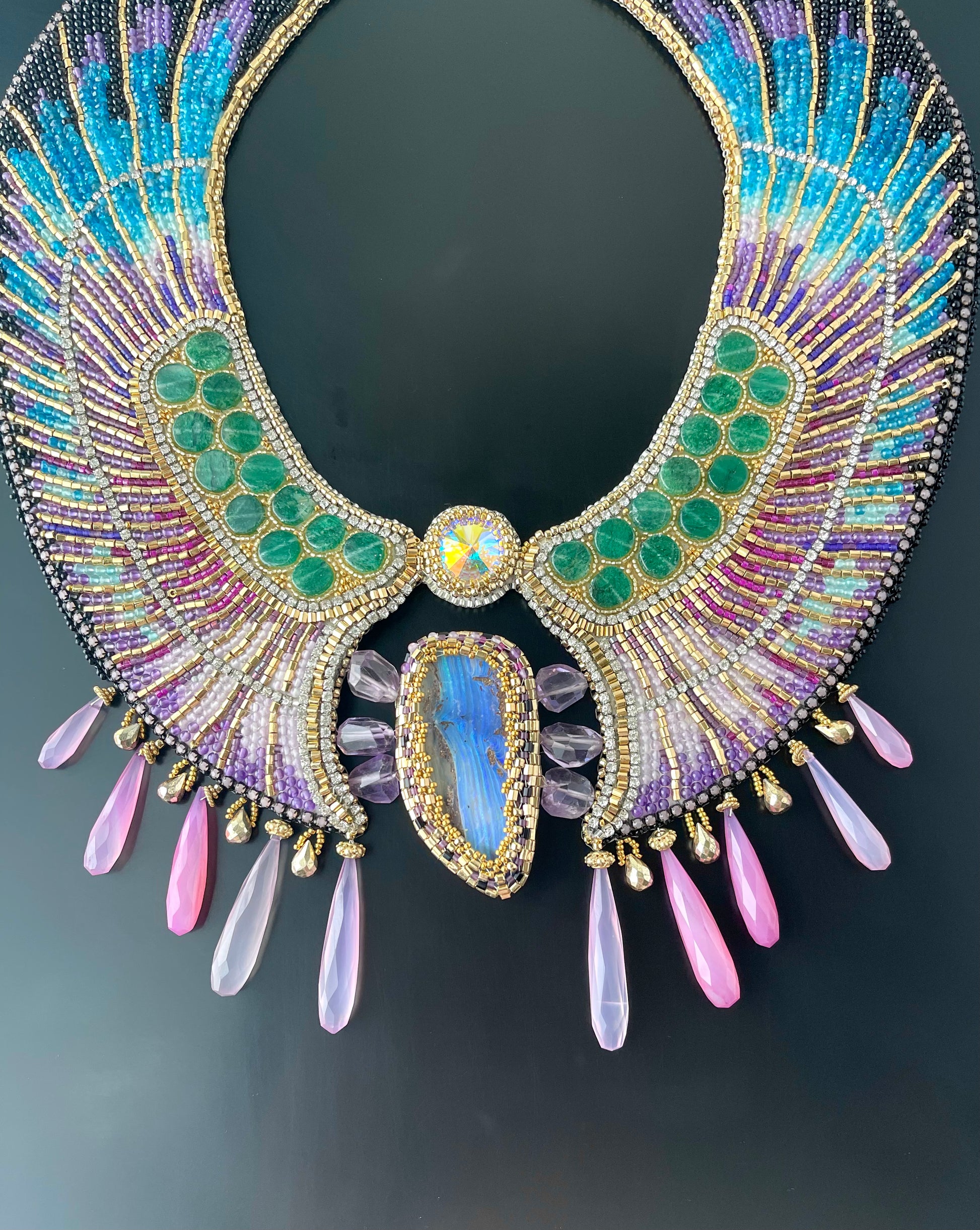 Opulent Decadence - Metamorphosis, winged abstract scarab collar necklace is embroidered with dainty gemstones and 24k gold plated Japanese seed beads.
