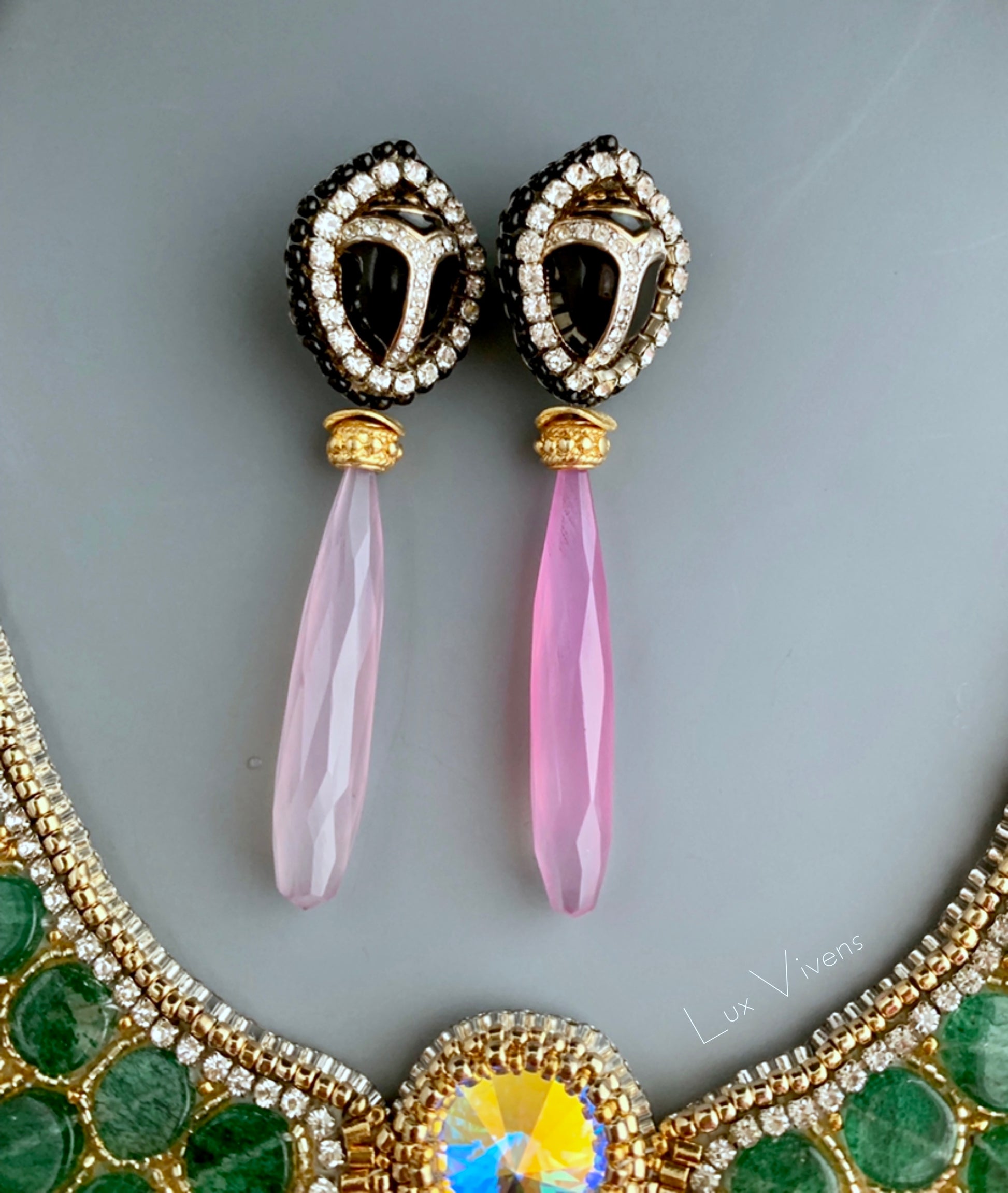 The necklace comes with stud dangle earrings made with vintage black enamel scarabs and faceted long pink chalcedony briolettes to match in color palette and style.