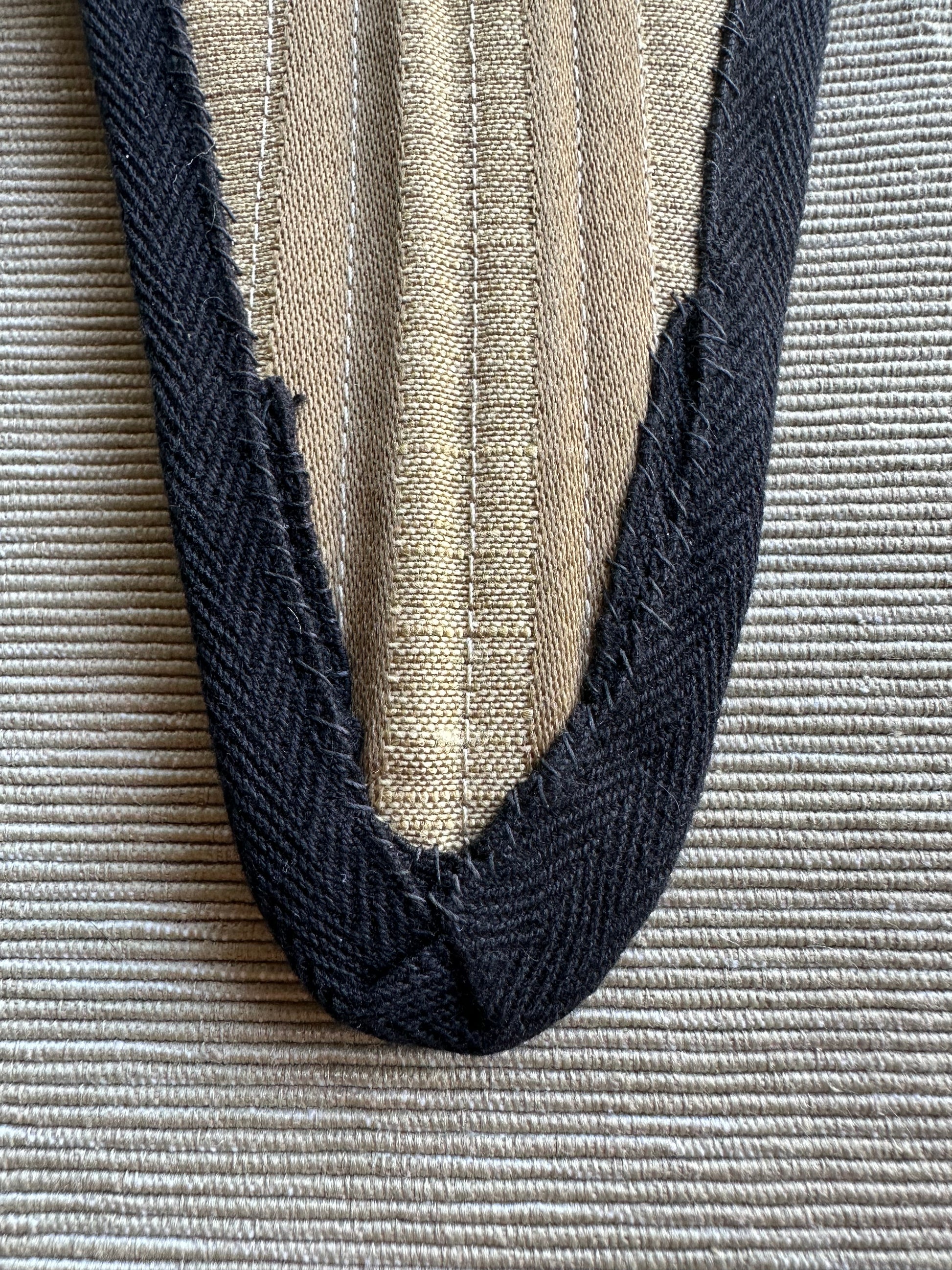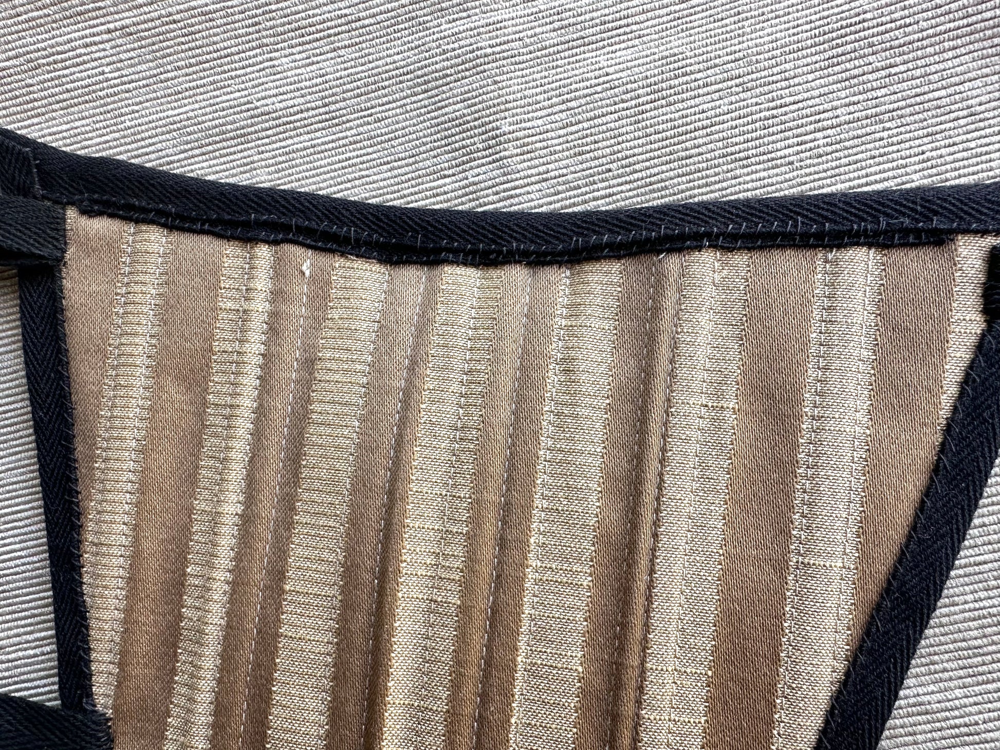 Cotton twill tape edging with decorative stitching on the front (doubled tape on both exit points of boning).