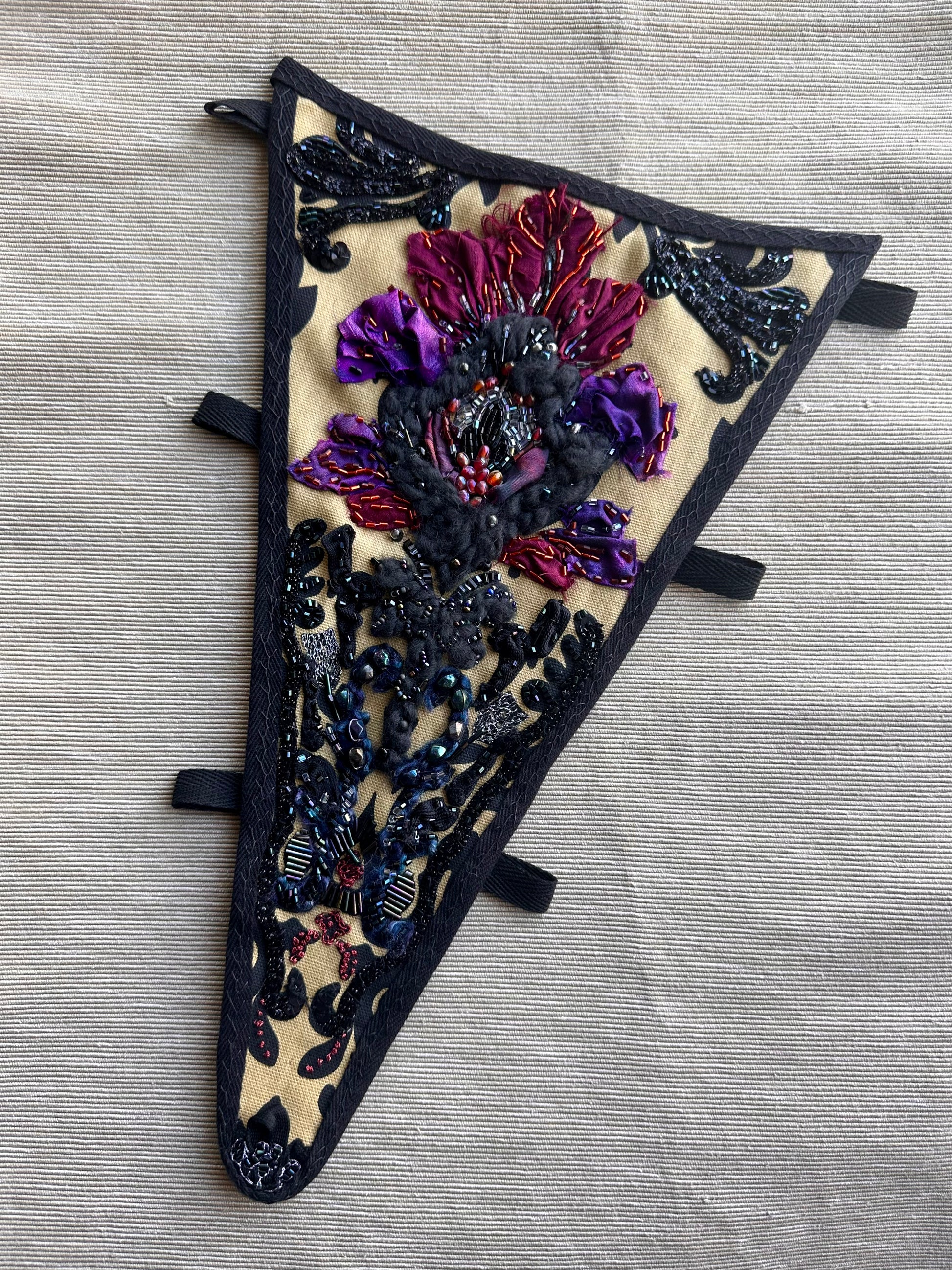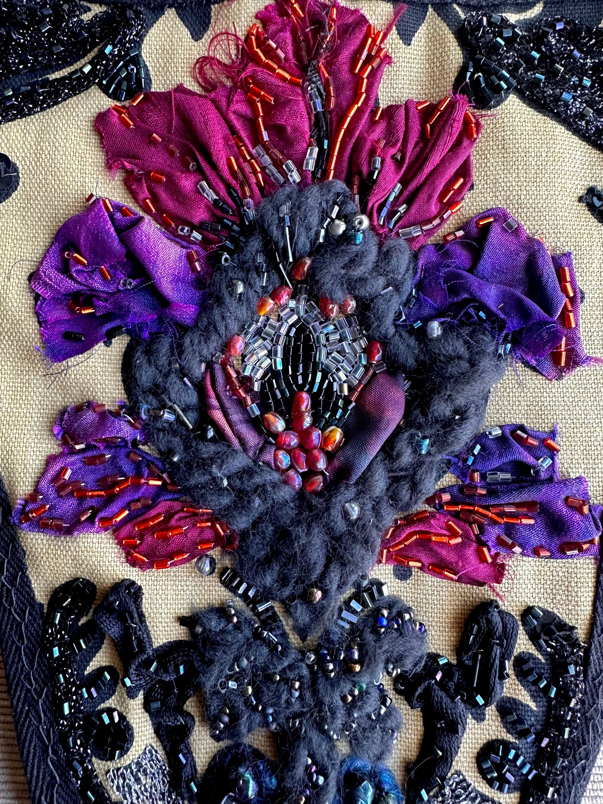 This is an opulent, dark romantic floral hand embroidery with glass beads, silk ribbon, yarn, metallic thread and sequined trim.