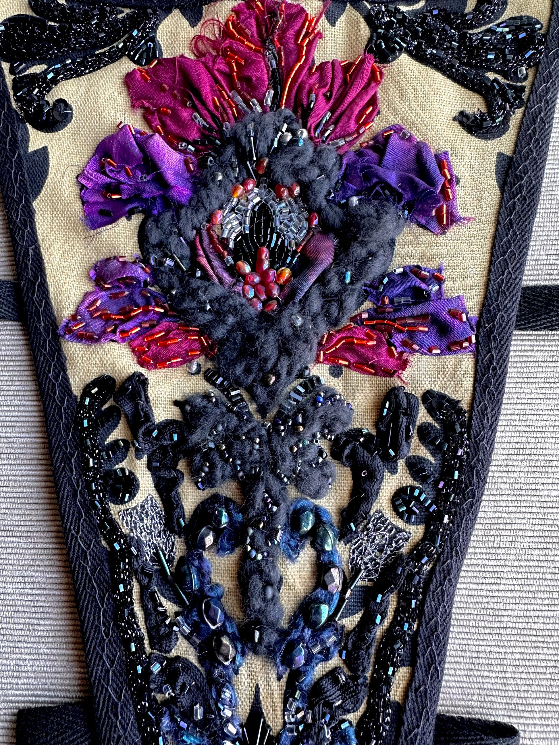 Late 17th century inspired textile art and bead embroidery boned stomacher with tabs for attachment to a bodice, a historical free style recreation of late Baroque, circa 1690