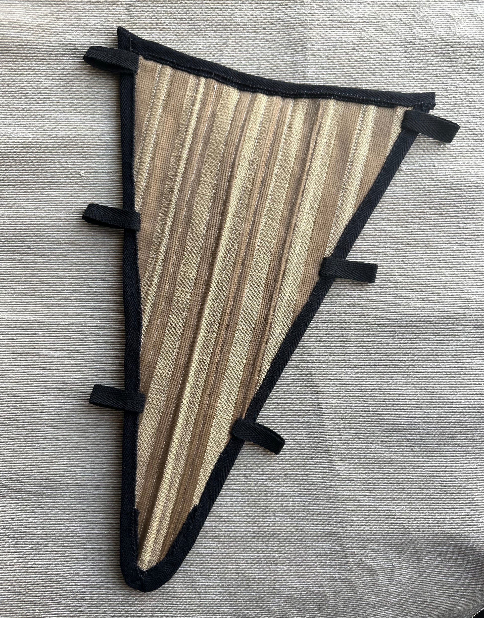 The stomacher consists of three layers: front embroidery on cotton canvas, cotton interlining, and cotton-polyester striped jacquard lining. Synthetic boning.