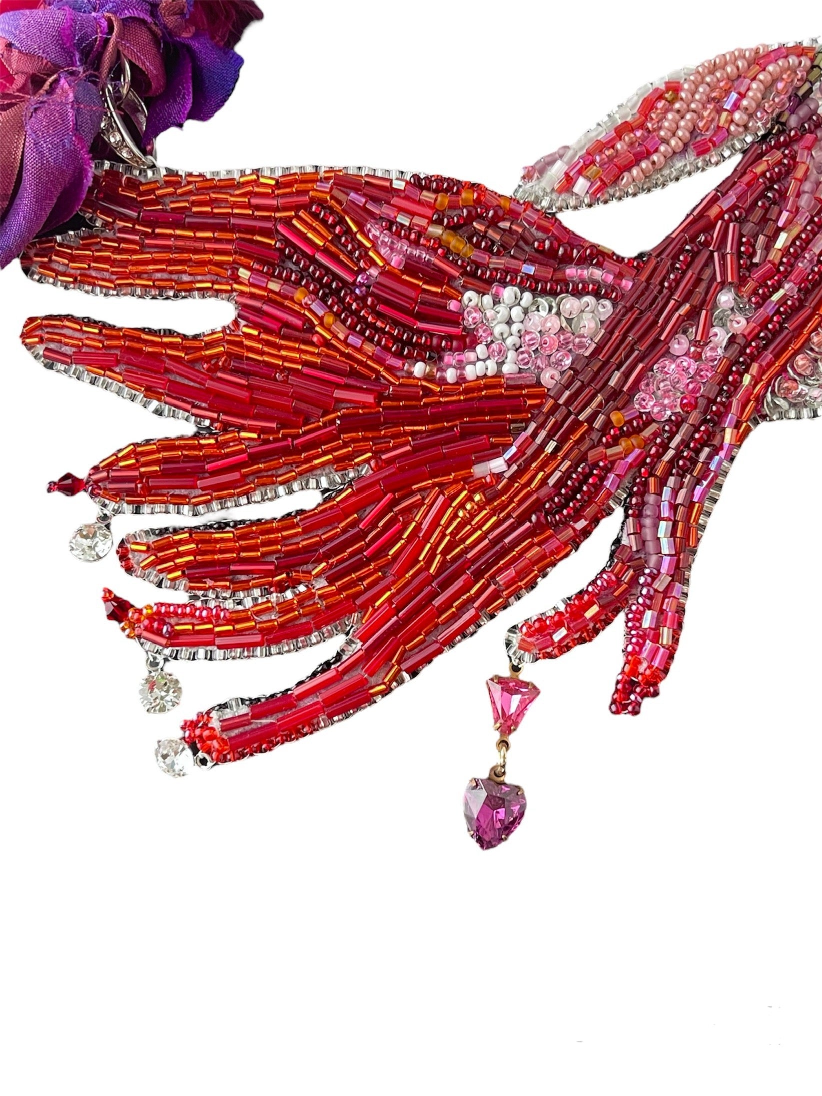 Magical Catch Red Betta Fish Sparkly Necklace, Bead Embroidery Wearable Art with Glass, Pearls, and Crystal Beads on Silk Magenta Braid Rope
