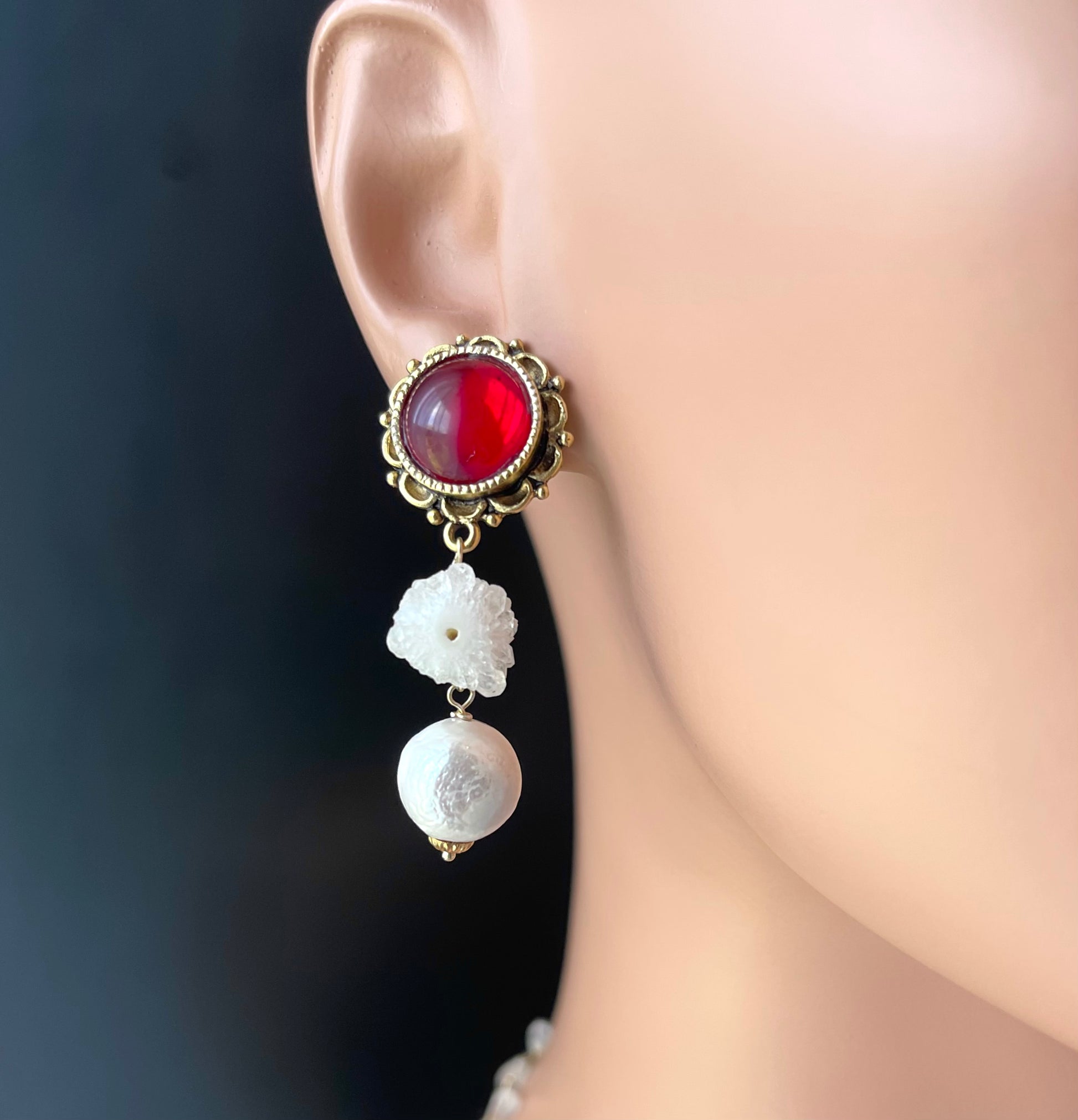 Snow Queen Red Glass & Baroque Pearl Drop Earrings with Stalactite; Historical Themed Jewelry Accessories