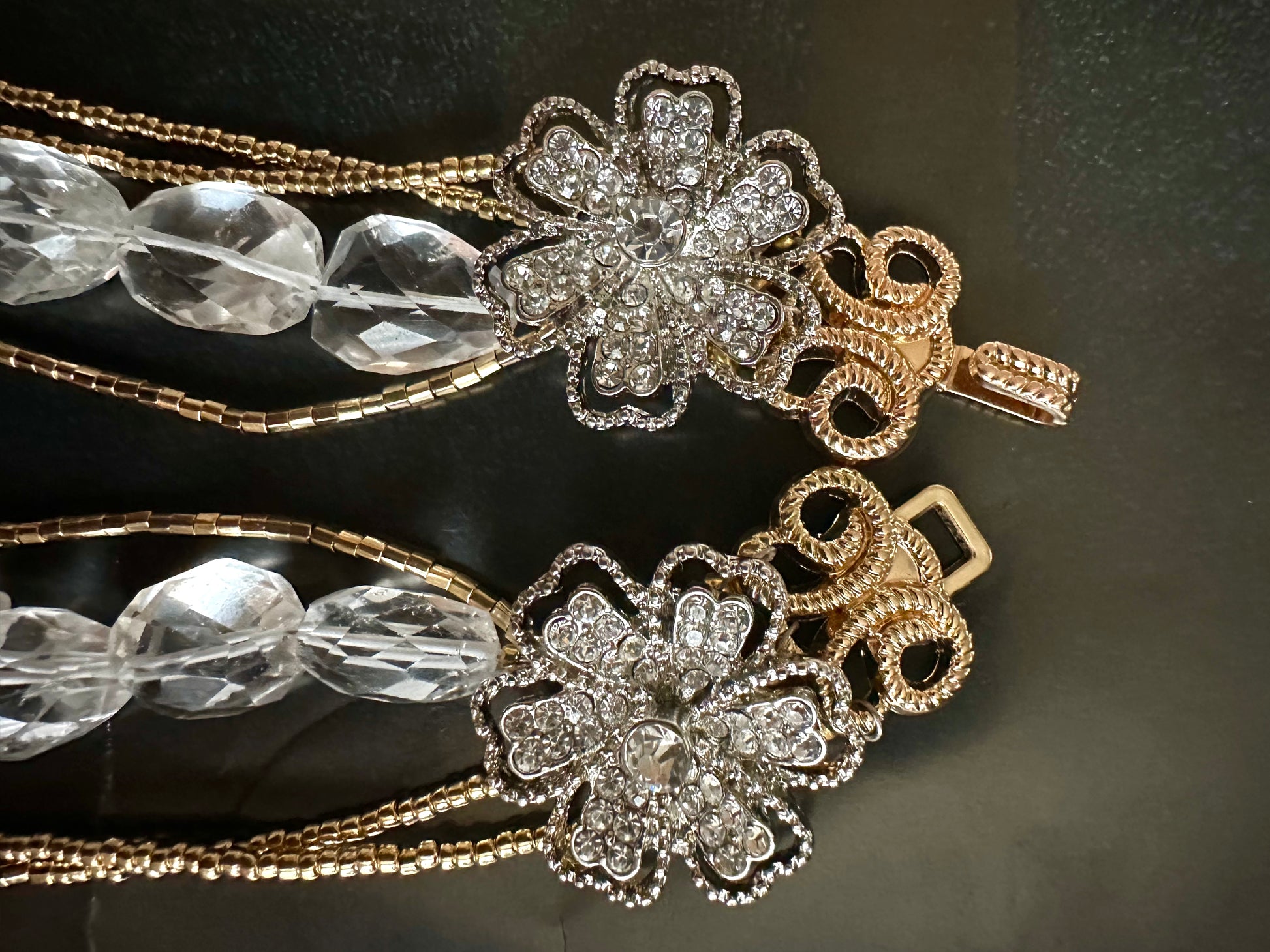 Materials: gold plated vintage pendant, faceted Quartz crystal, freshwater pearls, tourmaline, aquamarine, frosted glass, 24k gold plated seed beads, gold plated coin beads, silver tone rhinestone filigree, gold tone clasp.