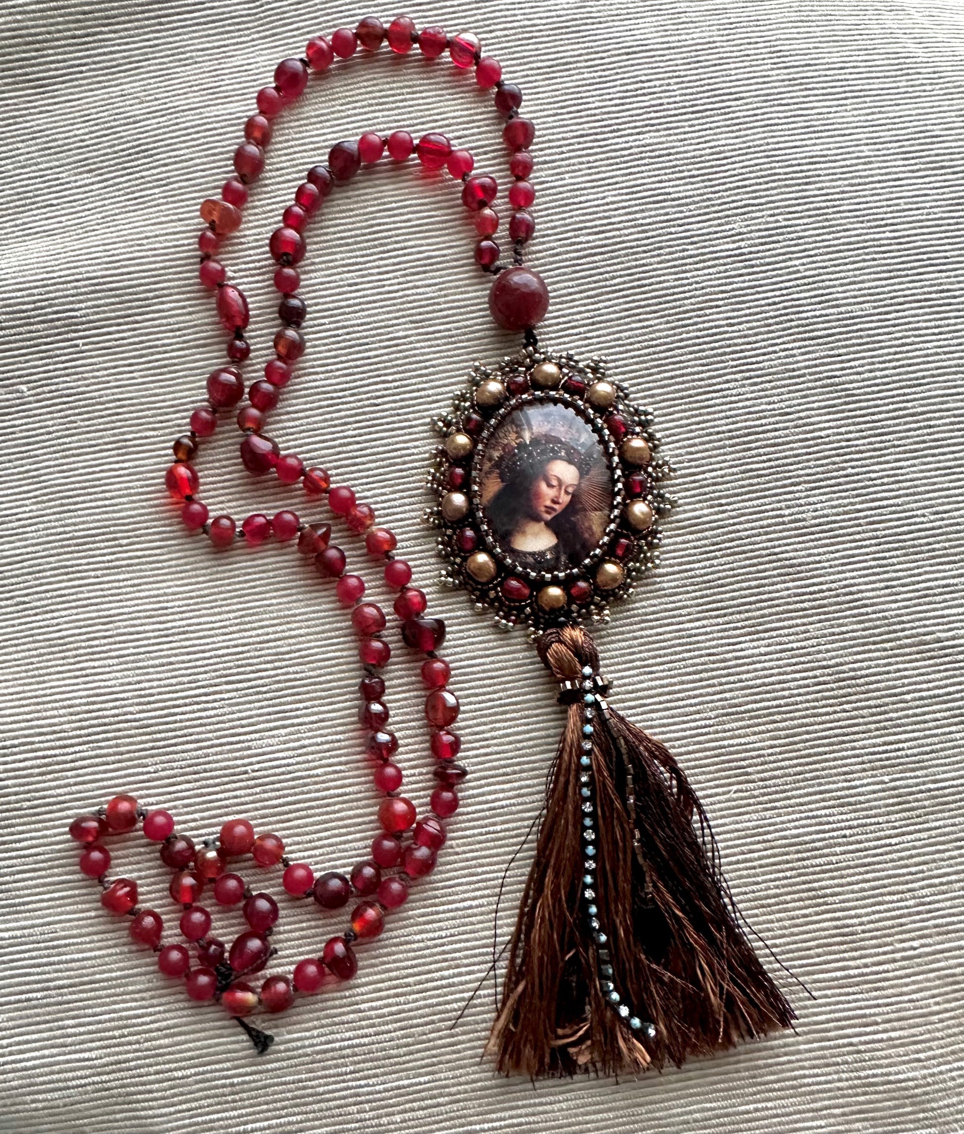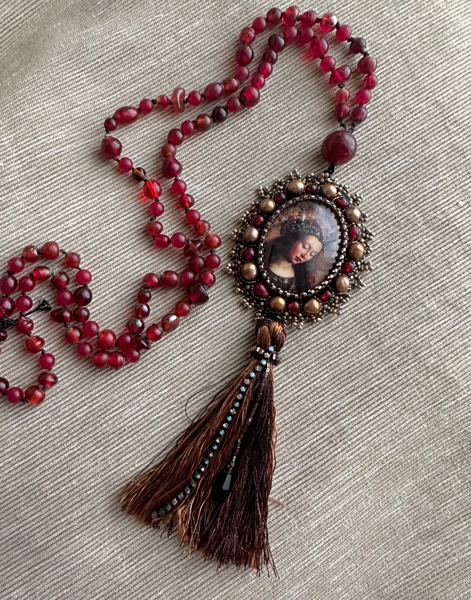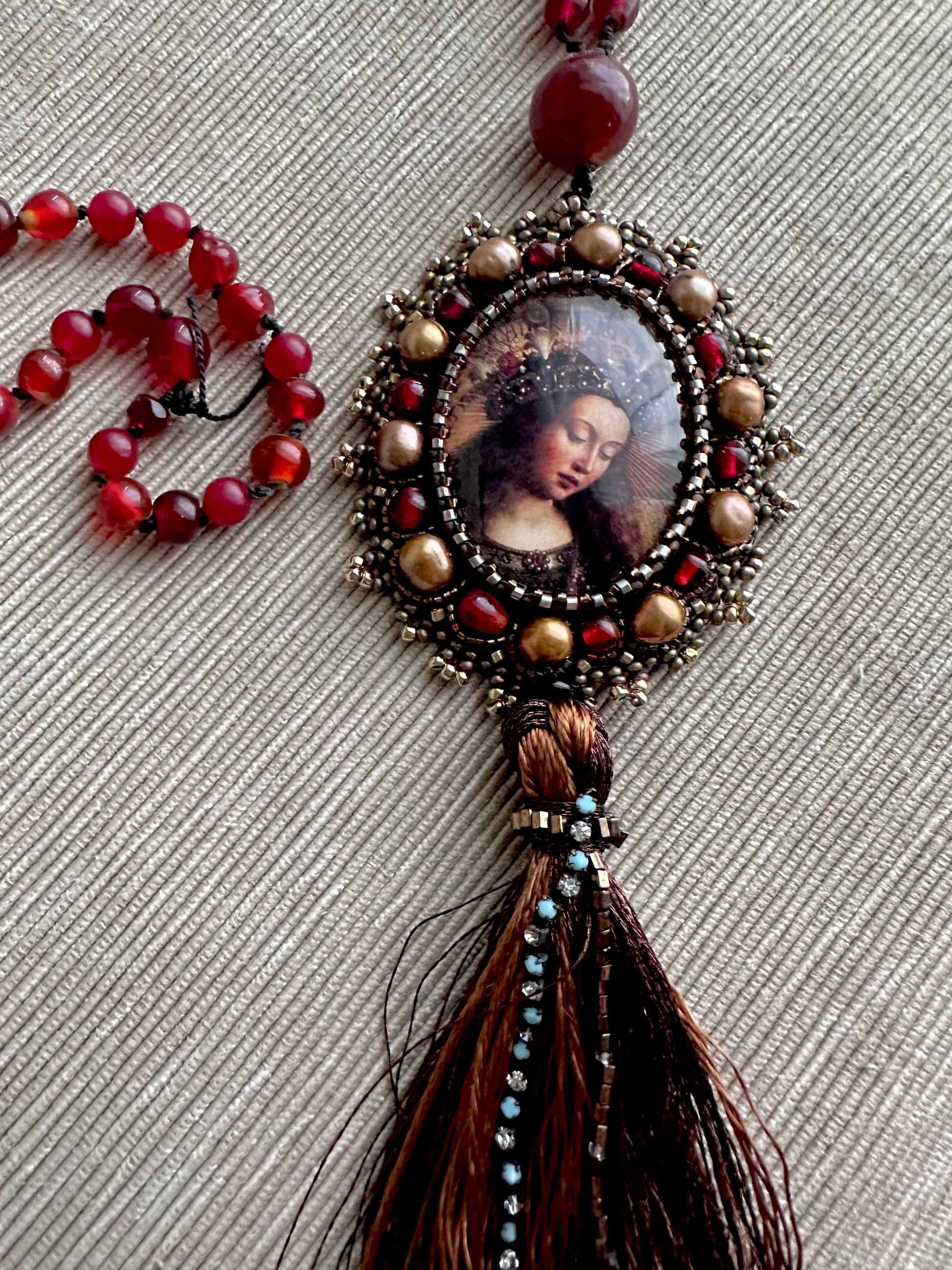 Sacred jewelry, late medieval style knotted necklace with bead embroidered Virgin Mary medallion and a handmade embroidery floss tassel.
