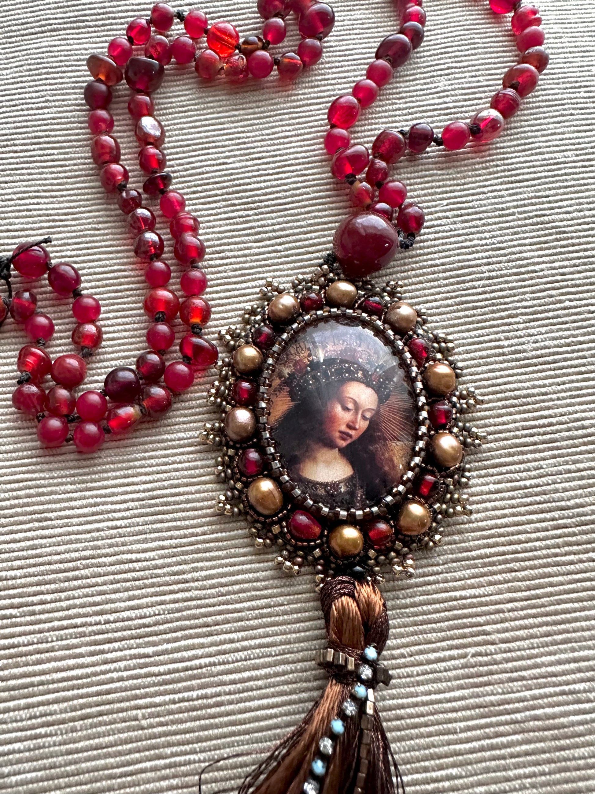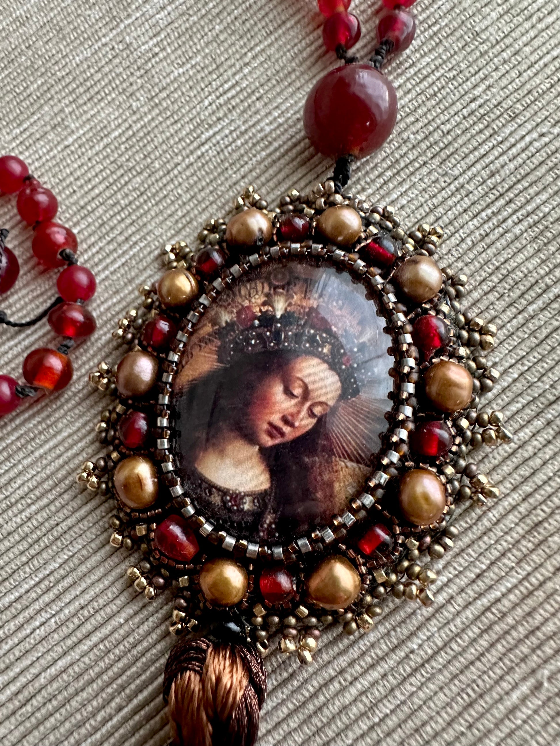 The focal cabochon depicts Virgin Mary from an altar piece by Dutch painter Jan van Eyck. It is set in a seed bead embroidered bezel with freshwater pearl and red glass halo.