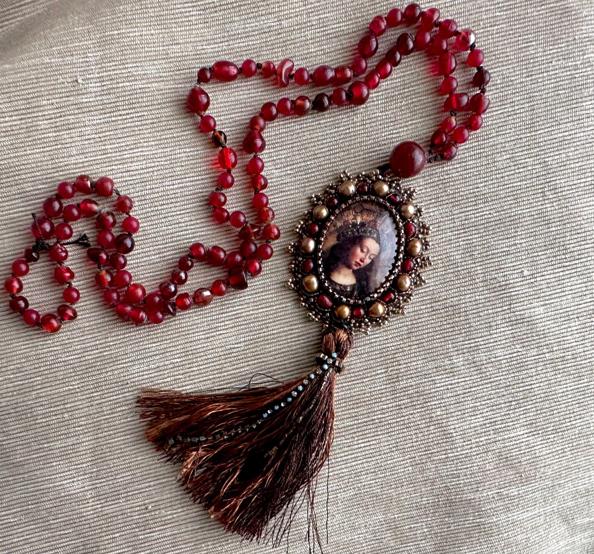 Virgin Mary Catholic Sacred Jewelry; Extra Long Silk Knotted Necklace with Pomegranate Red Glass Beads and Embroidered Medallion