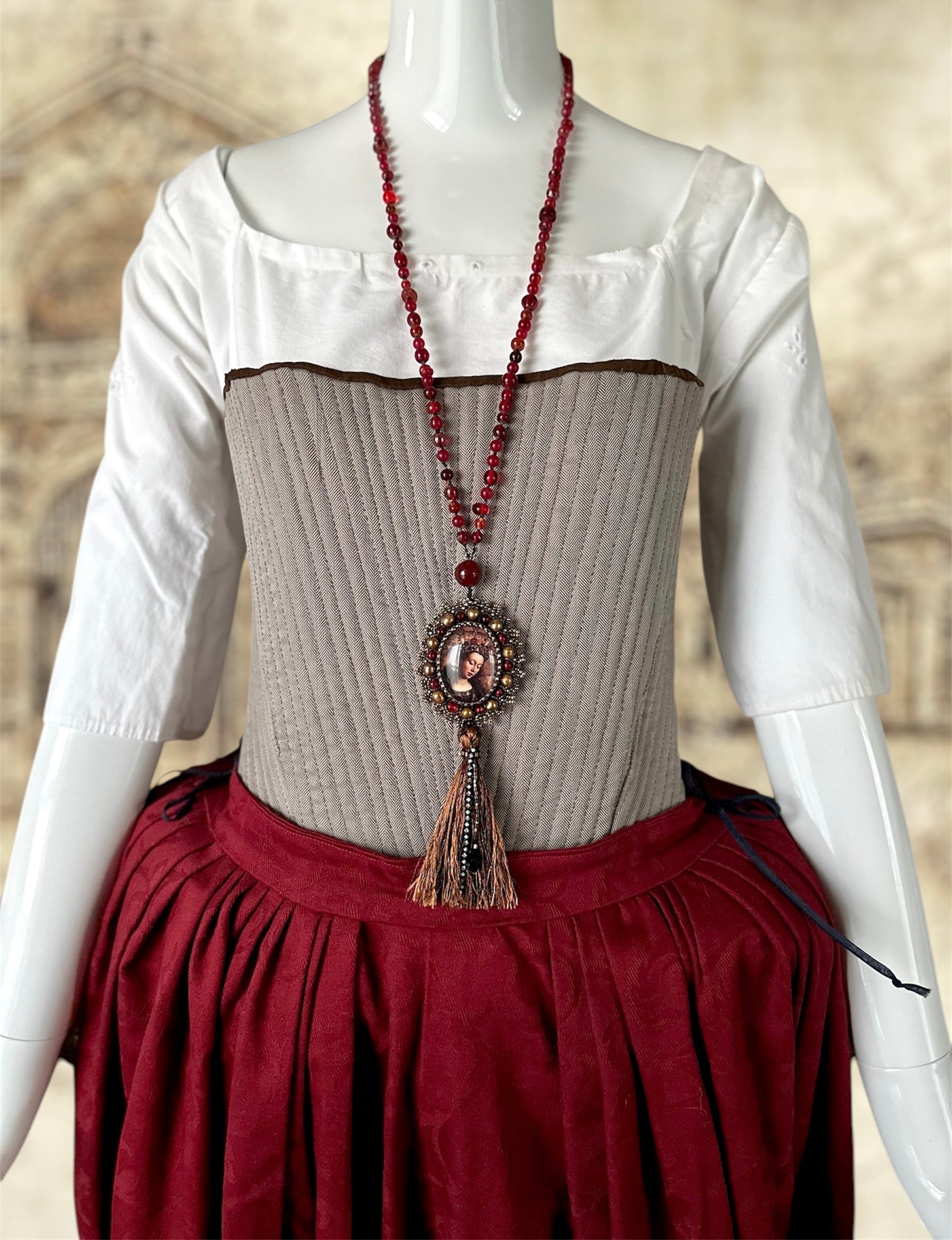 Materials: Pomegranate red glass beads, cranberry dyed jade, dark gold freshwater pearls, black silk cord, glass cabochon, aged bronze and copper color seed beads, rayon and metallic floss. Black leather lining on the medallion.